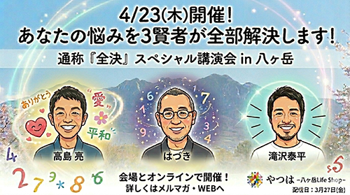 たきさわたいへいコラム1:【4/23(木)開催】あなたの悩み、八ヶ岳の「3賢者」が全て解決します!
