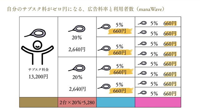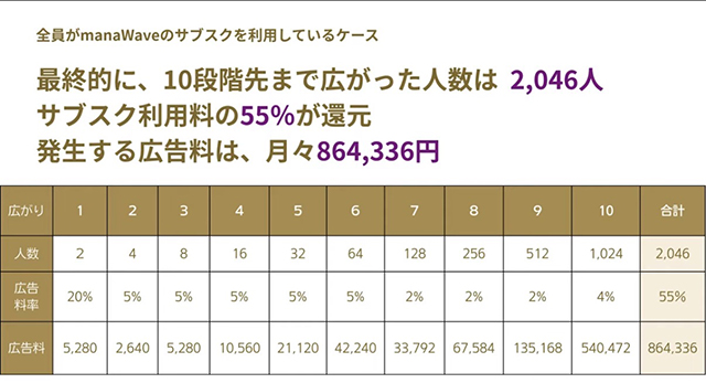 その場合、manaWave(磁力線発生装置)の例だと、10段階先で2,046人まで広がり、そこで広告費として86万円/月に受け取れる人もいます。